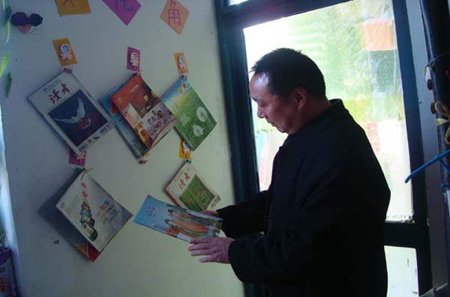 姚書記饒有興趣地翻閱學生寢室內的圖書
