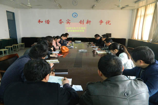 為深入學習黨的十八大精神、準確掌握新黨章知識。4月17日下午,機械與電子工程系舉行全系教師黨員學習新黨章知識競賽。競賽由系副主任何振華同志主持。比賽結束后,系黨總支書記嚴綱同志作了簡單總結,他指出了學習新黨章的重要性和必要性,說明了舉辦此次知識競賽的積極意義,高度評價了教師黨員們的認真態度,并號召大家要更加深入地學習十八大精神,學習新黨章,進一步提高思想認識,凝聚精神力量,營造學習氛圍,提升理論素養,為學院和系部的發展貢獻力量。