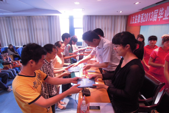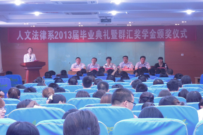 典禮在莊嚴的國歌聲中開始。學院黨委副書記、紀委書記劉芳首先發表講話,她對同學們三年來的努力表示肯定,也希望同學們在走出學校后在社會上能夠更有作為。江蘇群匯律師事務所的律師代表也前來為畢業典禮添光加彩,并為獲得“群匯獎學金”的同學們頒獎。江蘇群匯律師事務所主任朱桂前律師在會上鼓勵人文法律系獲得獎學金的學生們在畢業后的工作中能夠克服困難、珍惜生活,發奮圖強,以優異的成績回報社會。人文法律系主任金濤在隨后的講話中也表示希望同學們在走上社會后也不要停止學習,要“活到老學到老”。