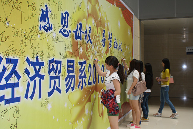 “學長,簽個名吧”,“同學,你還有什么未完成的心愿嗎?”一面印有“感恩母校,尋夢起航”的心愿墻上,每位畢業生像明星一樣簽上自己的名字,同時也寫上畢業離校前最后的心愿。“我希望和輔導員老師合一張影。”更多的同學寫下了對老師、同學的祝福與感謝,大家對經濟貿易系的熱愛在此刻體現的淋漓盡致。同學們寫下畢業心愿的同時,流露出更多的是依依不舍。