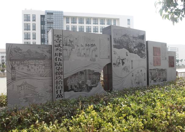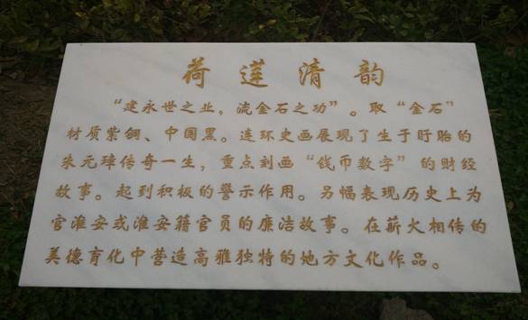 “荷蓮清韻”依學校東湖而建。“建永世之業,流金石之功”。取“金石”材質紫銅、中國黑。通過連環史畫展現了生于盱眙的朱元璋傳奇的一生,重點刻畫“錢幣數學”的財經故事。起到積極的警示作用。同時遴選集結了表現歷史上為官淮安或淮安籍官員的廉潔故事,在薪火相傳的美德育化中營造高雅獨特的地方文化作品。