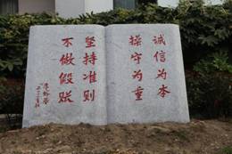 走進清風苑,首先映入眼簾的是一塊刻有“廉”字的景觀石,“廉”字附于石頭之上,石頭寓意堅定不移。與廉石相對稱的是一造型別致的算盤石雕,金燦燦的算盤上算珠撥出“19646”,表達我校成立于1964年6月。石雕基座上刻有“算好人生‘七筆賬’:‘政治賬’、‘經濟賬’、‘名譽賬’、‘家庭賬’、‘親情賬’、‘自由賬’和‘健康賬’,字以朱砂著色,十分醒目。算盤后方竹林翠綠,林下有一小石,上書“廉”。移步入苑,扇形石雕鐫刻“廉”字,提醒財會工作者時刻把廉字放在心中。清風苑中心的書型石雕,則鐫刻著朱镕基總理的題詞誠信為本,操守為重,堅持準則,不做假帳”和刻有一則明清官吏引以自戒的座右銘:“公生明,廉生威”字樣的石頭,時刻提醒作為財會人員“不做假賬”。與之對稱的方圓石雕“規矩”,由校正圓形、方形的兩種工具組成,文字配以“沒有規矩,不成方圓。要弦正心,不偏不離。”意在警示人們凡事要遵紀守法,不可偏離正道。