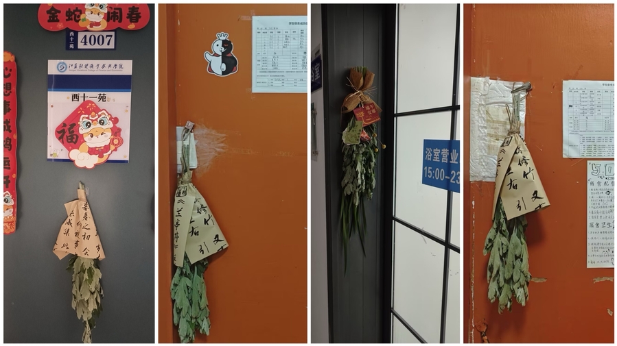 最后,同學(xué)們將制作好的艾草花束懸掛于宿舍門楣上。翠葉與紅綢相映,艾香裊裊中, “驅(qū)邪祈福” 的傳統(tǒng)寓意與現(xiàn)代校園生活交融,為佳節(jié)更添一抹安康祥瑞的底色。