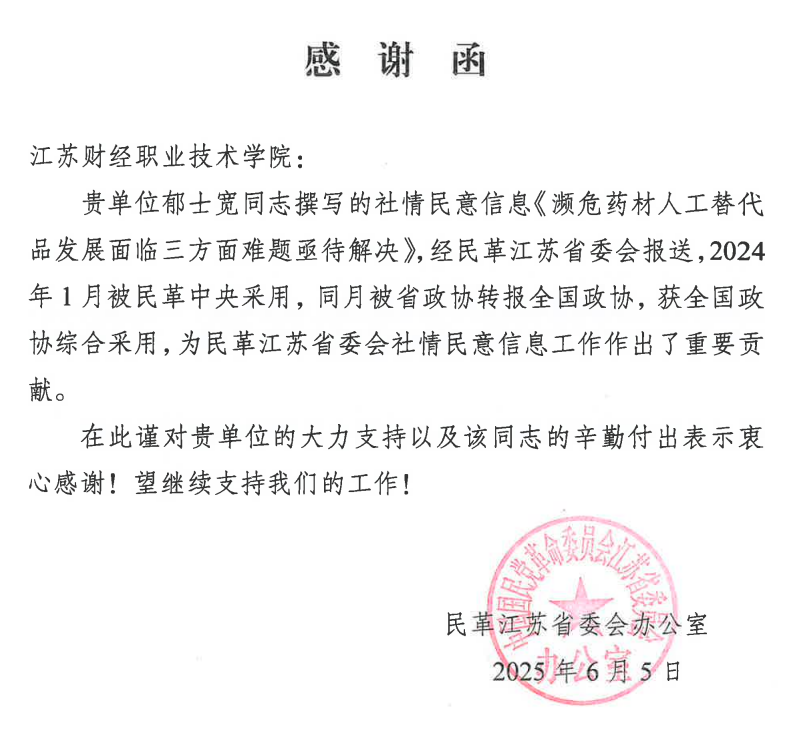 郁士寬同志撰寫的社情民意信息著眼于中醫臨床處方中使用率高、需求量大并制約中醫藥高質量發展的藥材瀕危問題,對“標準體系、申報流程、推廣應用”等方面的現存難題進行分析,并提出有效建議。民革江蘇省委給我校發來感謝函,對我校大力支持民主黨派成員建言獻策表示衷心感謝。