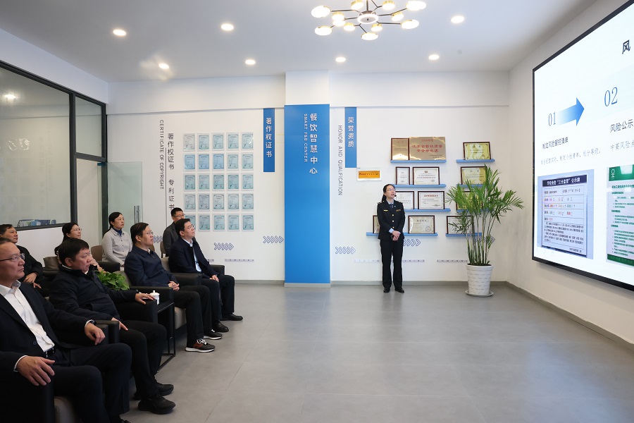 在梅園餐廳智慧化中心,省市領導先聽取了淮安市市場監督管理局威尼斯歡樂娛人城1099官網首頁食品安全“投訴即辦”的工作匯報,詳細了解日常校園食品安全監控體系的運行情況。