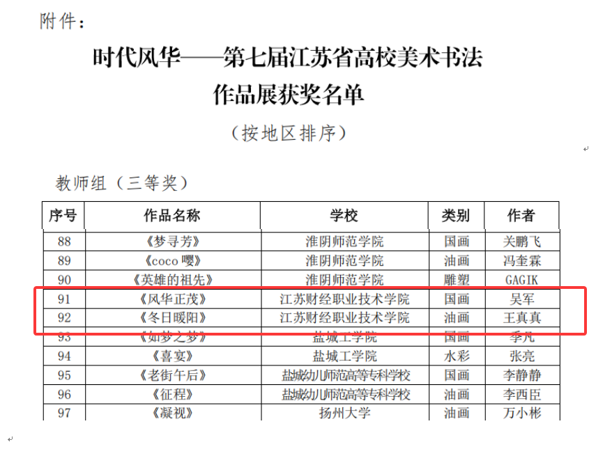 近日,由江蘇省教育廳主辦的“時代風華——第七屆江蘇省高校美術書法作品展”圓滿收官。本次作品展吸引全省一百余所高校踴躍投稿,共收到各類美術書法作品5030件。經過嚴格的初評、復評環節,最終評選出各級獎項。我院教師吳軍的作品《風華正茂》、王真真的作品《冬日暖陽》,在全省本科及專科院校教師組的876件參賽作品中脫穎而出,雙雙榮獲教師組三等獎,為學院贏得了榮譽。